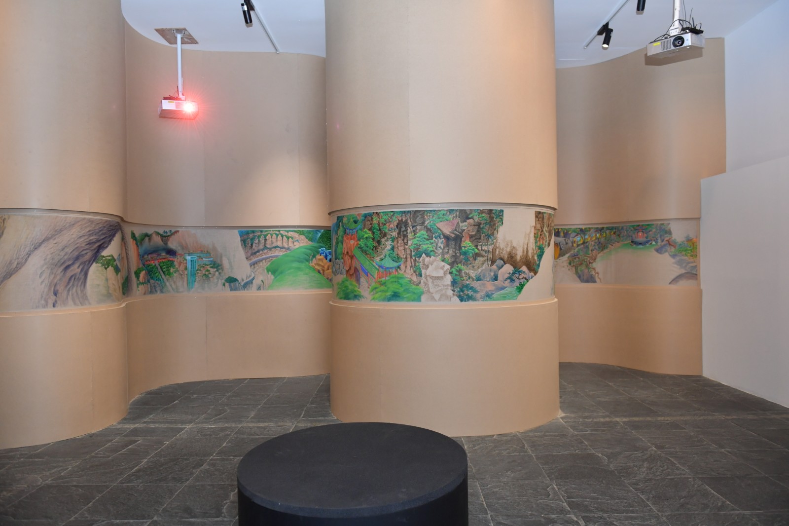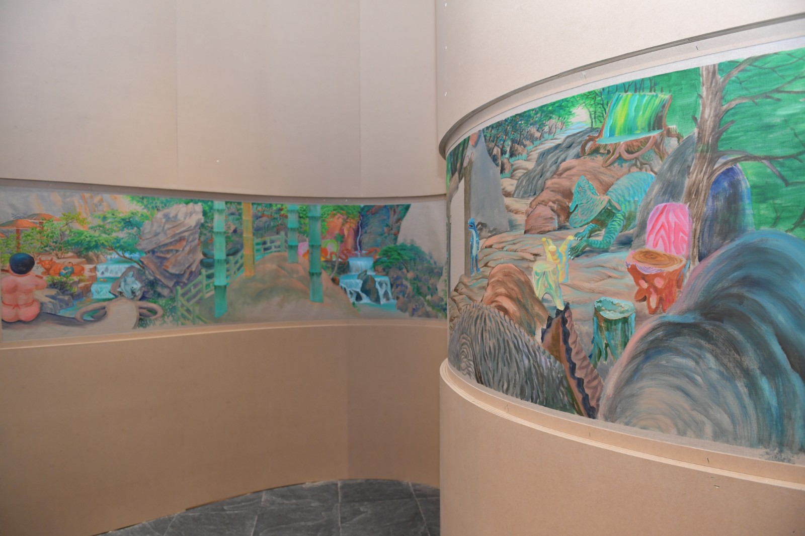 “地洞”一旁是展廳的下沉區(qū)域,這里被策展人設(shè)計為去往“桃花源”的實體路徑。梁碩的《景了個區(qū)》出現(xiàn)在這個下沉空間的一排四個口袋式的連續(xù)隔間墻面上,從空間上來說是無比契合的。回顧梁碩2019年在北京公社的展覽《梁碩:景區(qū)》同樣可以見到這樣一種迂回的觀展路徑。“景區(qū)”這個概念的提出,在藝術(shù)家看來代表著今天人們對山水的理解,這個獨(dú)特的概念跨越了自然景觀與都市空間。梁碩在自己撰文的《景了個區(qū)》中復(fù)原了一個景區(qū)籌備建立起來的小故事,承包景區(qū)改造的劉工在工期接近尾聲時,看到自己的“杰作”時不由感嘆:“這些水泥造物,居然都妥妥的在那了,像是本來就是從山里長出來的,那巨大的假山石和假樹根顯得造型怪異,卻頗得陳老蓮氣韻,在落日的余暉中與真山融為一體,真山也像了假山……”[6]景區(qū)的建立勢必意味著人工、商業(yè)、消費(fèi)對自然景觀的直接侵入與改造,空間、審美、意識形態(tài)等一系列問題由此發(fā)生。