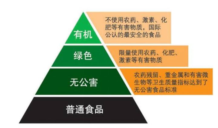 我國(guó)對(duì)農(nóng)產(chǎn)品的安全分類,包括有機(jī)、綠色、無公害三個(gè)等級(jí)。分別指對(duì)化肥、農(nóng)藥、激素、轉(zhuǎn)基因使用的不同要求。先看一張圖: