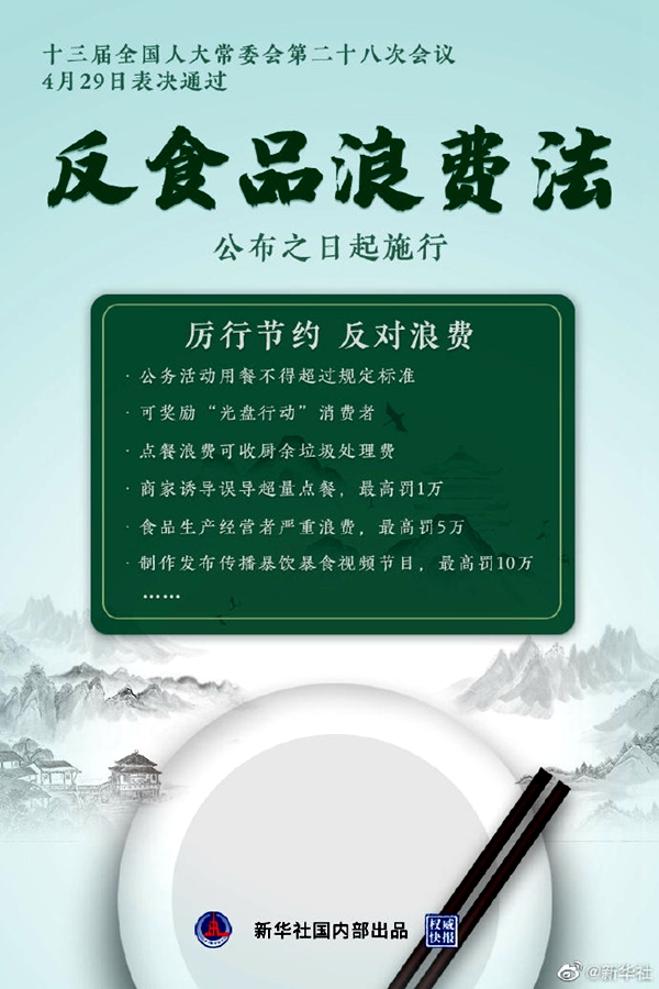 十三屆全國人大常委會(huì)第二十八次會(huì)議29日表決通過反食品浪費(fèi)法,自公布之日起施行。弘揚(yáng)傳統(tǒng)美德、保障糧食安全,防止食品浪費(fèi)從此有法可依。(新華社記者羅沙 任沁沁 海報(bào)設(shè)計(jì)楊軼群)