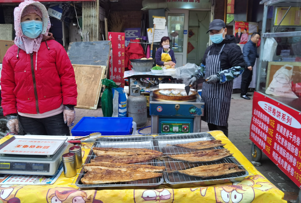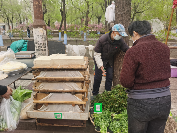 早市的吸引力在于“看”。早市上,各攤主會(huì)想各種各樣的方式招攬顧客,有的會(huì)用廣告牌,有的會(huì)吆喝。早市上的商業(yè)運(yùn)作方式也非常有趣,比如現(xiàn)場擠羊奶,旁邊拴幾頭奶羊,當(dāng)招牌;賣刀切面的現(xiàn)場切,炸油條的現(xiàn)場炸,都是明檔手工,這幾乎是大多數(shù)早市商家的促銷手段。也有推銷老花鏡的,賣衣服的,會(huì)現(xiàn)場吆喝“正宗商品專柜,清倉促銷”——這大概是現(xiàn)在“直播帶貨”的線下模式。住在早市附近的居民,有的會(huì)在樓上用繩子吊下個(gè)籃子,讓攤主把東西放到籃子里,直接拽上去。