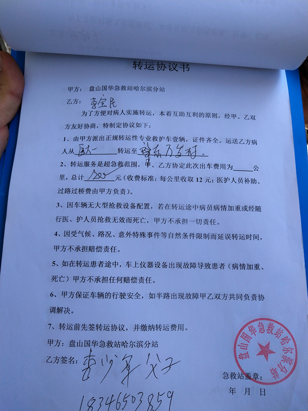 記者詢問了其中一名駕駛員車輛的相關(guān)手續(xù)和單位的資質(zhì),對方表示不清楚,他們只是司機,負責(zé)開車,一個月工資3000元錢,公司指派去哪接人送到哪,他們就按照指示去做。記者又問到:你們是怎么收費的?最遠去到哪?車上有沒有醫(yī)護人員?對方說最遠就是呼蘭,沒出過哈市,收費就是按照公里數(shù)收費。隨后工作人員在車里找到了轉(zhuǎn)運協(xié)議書,其中一張顯示車輛從醫(yī)大一院轉(zhuǎn)運至肇東市,收取費用是1200元(收費標準:每公里收取12元,醫(yī)護人員補助、過路過橋費由甲方負責(zé))。針對此情況,由于不確定車輛是否具備營運資質(zhì),需要和遼寧還有患者家屬方面核實,所以將車輛的相關(guān)證件暫扣。