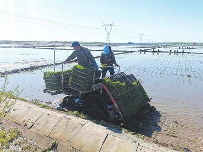 坤站村稻豐糧食種植農(nóng)民專業(yè)合作社理事長(zhǎng)楊軍介紹,受氣溫影響,今年插秧比往年延遲一周左右,為了把時(shí)間搶回來(lái),合作社社員起早貪黑,從早晨四點(diǎn)多就開(kāi)始插秧。合作社今年種植水稻面積3000多畝,為抗低溫、保全苗、奪高產(chǎn),全部采用機(jī)械化插秧,一臺(tái)插秧機(jī)每天可插秧50畝。楊軍說(shuō),去年建設(shè)的水稻公園成為游客網(wǎng)紅打卡地,今年在稻田公園新設(shè)計(jì)一個(gè)慶祝建黨100周年和鄉(xiāng)村振興的彩繪圖案,助力鄉(xiāng)村旅游業(yè)發(fā)展。
