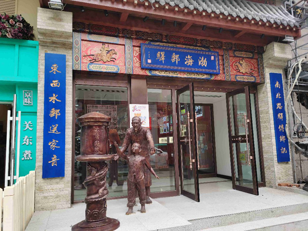 來(lái)到位于解放路的渤海郵驛主題郵局,古香古色的門頭下,是身著清代服飾的祖孫倆正在向郵筒里投遞信件的場(chǎng)景雕塑。
