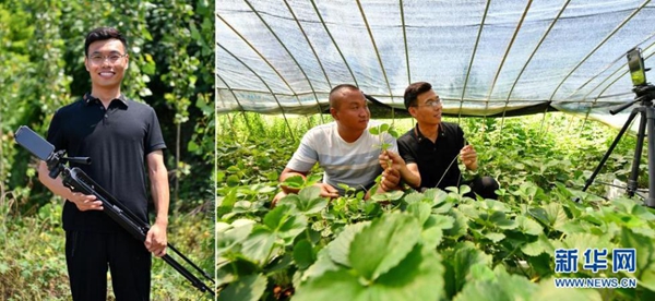 拼版照片:左圖為張成蘊(yùn)在山西省運(yùn)城市絳縣臨澮村的田間;右圖為張成蘊(yùn)(右)在大棚里錄制農(nóng)業(yè)科普視頻(7月14日攝)。今年34歲的張成蘊(yùn)大學(xué)畢業(yè)后,一直熱衷于用拍攝視頻的方式宣傳家鄉(xiāng)的風(fēng)土人情。2018年8月,他開(kāi)始在社交平臺(tái)上幫助鄉(xiāng)親們直播帶貨,真誠(chéng)的笑容、優(yōu)質(zhì)的產(chǎn)品和專業(yè)的知識(shí)是他吸引粉絲的“訣竅”。