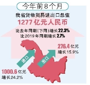 黑龍江日報訊(黑龍江日報全媒體記者 付宇)記者從哈爾濱海關獲悉,今年前8個月,我省貨物貿易進出口總值1277億元人民幣,比去年同期(下同)增長22.3%,比2019年同期增長2.7%。其中,出口276.4億元,增長15.9%;進口1000.6億元,增長24.2%。