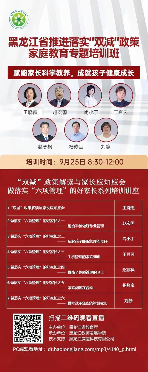 據(jù)了解,此次培訓(xùn)是《黑龍江省中小學(xué)“百萬(wàn)家庭賦能”工程實(shí)施方案》重要組成部分,也是省教育廳踐行黨史學(xué)習(xí)教育“我為群眾辦實(shí)事”,解決群眾急難愁盼問(wèn)題的具體舉措,由省教育廳主辦、黑龍江教師發(fā)展學(xué)院承辦,基礎(chǔ)教育處處長(zhǎng)領(lǐng)銜六位家庭教育專家共同開講,時(shí)長(zhǎng)三個(gè)半小時(shí),受到廣大家長(zhǎng)的一致好評(píng),取得良好的社會(huì)反響,直播時(shí)瀏覽峰值達(dá)到210.7萬(wàn)人次。培訓(xùn)內(nèi)容緊緊圍繞廣大家長(zhǎng)們“雙減”形勢(shì)下的困惑,深入宣傳“雙減”政策和年初以來(lái)教育部相繼下發(fā)的關(guān)于手機(jī)、作業(yè)、睡眠、讀物、體質(zhì)、考試等“六項(xiàng)管理”文件內(nèi)容,分七個(gè)專題進(jìn)行深入細(xì)致的家庭教育指導(dǎo),有的放矢地解答家長(zhǎng)“心中所疑”、化解家長(zhǎng)“心中所急”,很多家長(zhǎng)通過(guò)家庭學(xué)校群進(jìn)行交流,有的家長(zhǎng)反饋道:“通過(guò)觀看直播我們家長(zhǎng)深刻體會(huì)到一定要以身作則,在孩子面前少玩手機(jī),多陪孩子閱讀書籍,多讓孩子進(jìn)行戶外活動(dòng)?!庇械募议L(zhǎng)則表示,聽了講座深刻理解了孩子成長(zhǎng)的根基深植于家庭教育的道理,家庭教育才是孩子的起跑線,主動(dòng)地配合學(xué)校落實(shí)“雙減”政策,從做好“六項(xiàng)管理”入手科學(xué)優(yōu)化家庭教養(yǎng)方式,減少孩子的校外培訓(xùn)和作業(yè)負(fù)擔(dān),還給孩子一個(gè)幸福的童年,做一名智慧家長(zhǎng)。