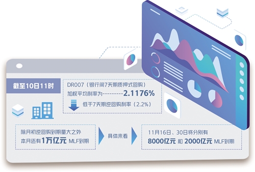 數(shù)據(jù)顯示,11月1日至5日,共計(jì)1萬億元規(guī)模的逆回購陸續(xù)到期。除月初逆回購到期量大之外,本月還有1萬億元MLF到期,為今年以來最高值。具體來看,11月16日、30日將分別有8000億元和2000億元MLF到期。