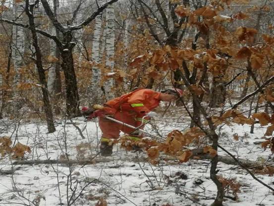 在經(jīng)過一段緊張嚴格的產(chǎn)前技能及安全培訓后,紅星林場職工們備齊生產(chǎn)工具和防護物品,每天頂著未褪盡的夜色出發(fā),天剛冒亮就開工,在積雪覆蓋的林間不停穿行,鋸手手持割灌機把作業(yè)規(guī)程要求的各類林內(nèi)枯死、風折枝干伐除,后面的歸堆工緊隨其后,把割下的枯干枝條有序的理順碼成堆。各小組分工明確,配合嫻熟,漫山雜亂的倒木藤條在工人們的手下被梳理的清晰利落,寂靜的山林也在機器的轟鳴和工人們的笑聲中熱鬧起來。