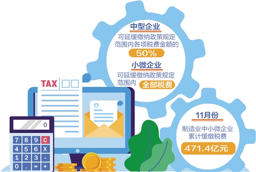剛剛過去的11月是制造業(yè)中小微企業(yè)階段性稅收緩繳政策實施首月。12月1日,國家稅務總局發(fā)布統(tǒng)計數據顯示,這項政策實施效果顯著,制造業(yè)中小微企業(yè)已累計緩繳稅費471.4億元。