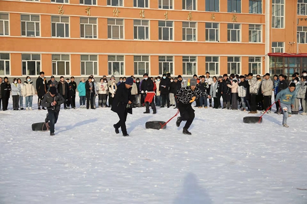 組織開展拉輪胎跑比賽。拉輪胎跑比賽在各年級間進(jìn)行,每班6名選手,50米往返,以時間少者為勝。隨著裁判老師一聲令下,比賽開始,選手們立馬拉起了輪胎奮力向前沖刺,克服雪地不利的條件,參賽選手飛快地向終點(diǎn)奔跑,掌聲、加油聲響徹操場。冬日的操場上,一個個