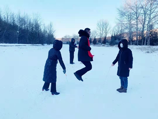 大家還在冰面上開展踢毽子、跳繩等系列活動,雖然在冰面上增加了難度,大家卻絲毫不減熱情,許多精彩的瞬間被定格。