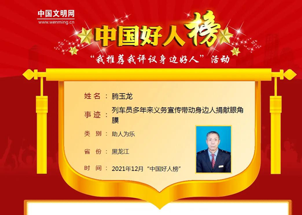 騰玉龍,鐵力市人,曾先后榮獲“龍江好人”“伊春好人”“最美鐵力人”等榮譽(yù)稱號。他曾多次捐贈造血干細(xì)胞,挽救了3個人的生命。在他的帶動下,他的家庭成為中國首個眼角膜、身體器官和造血干細(xì)胞捐獻(xiàn)志愿者家庭。騰玉龍同志入選2021年12月“中國好人榜”后,鐵力市精心組織策劃,動員廣大干部群眾為典型點(diǎn)贊助力,組織全市各單位、各社區(qū)居民學(xué)習(xí)“中國好人”先進(jìn)事跡。