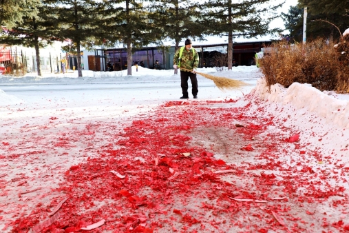 黑龍江經(jīng)濟網(wǎng)訊(王力 記者馬朝林)天剛蒙蒙亮,呈現(xiàn)眼前的是大年三十夜晚燃放的鞭炮紙屑,遍地開花,仿佛是紅地毯一樣。多名環(huán)衛(wèi)工冒著零下30多度的嚴寒,不顧帽子、眉毛結(jié)滿冰霜,有的用掃帚清掃,有的撿拾紙屑煙頭,有的推移垃圾箱……