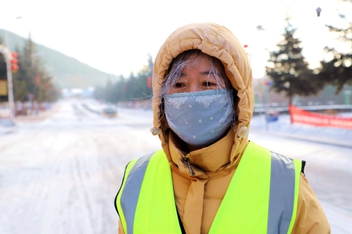 大年初一早上,清理生活垃圾的環(huán)衛(wèi)職工頭發(fā)上、帽子上結(jié)滿冰霜(王力 攝)