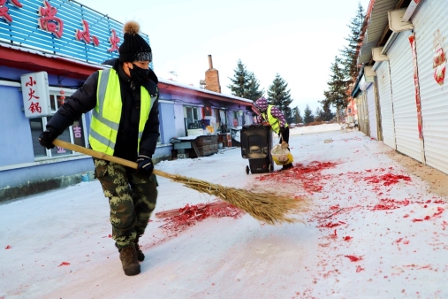 阿木爾林業(yè)局環(huán)衛(wèi)隊環(huán)衛(wèi)工人在大年初一早上清掃責任區(qū)鞭炮紙屑(王力 攝)
