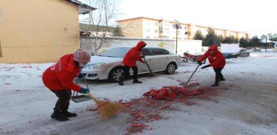 天色還未大亮,圖強林業(yè)局環(huán)衛(wèi)處的環(huán)衛(wèi)工人們已紛紛走上街頭,冒著零下三十多度的嚴(yán)寒開始清掃和清運工作。大大小小的垃圾箱里堆滿了節(jié)日當(dāng)中的生活垃圾,環(huán)衛(wèi)工人們迎著刺骨的寒風(fēng)不斷地清理這些生活垃圾,并將一車車?yán)\向垃圾站,他們的帽子、口罩、眉毛上都掛滿了冰霜,而寒冷卻沒有阻擋住他們工作的熱情。
