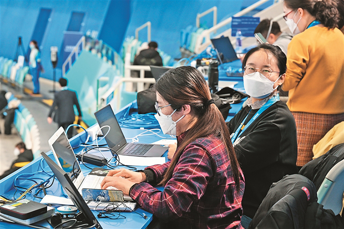 本報(bào)特派記者在冰絲帶現(xiàn)場寫稿。