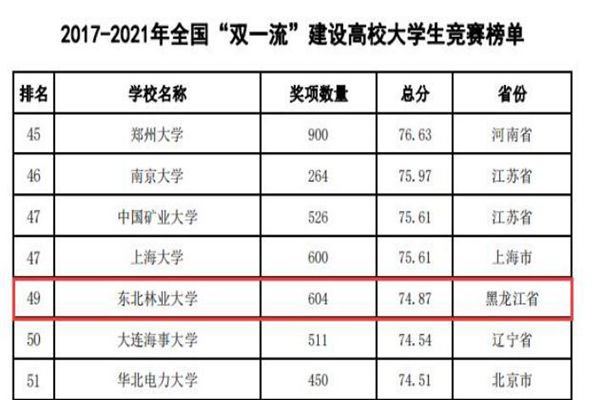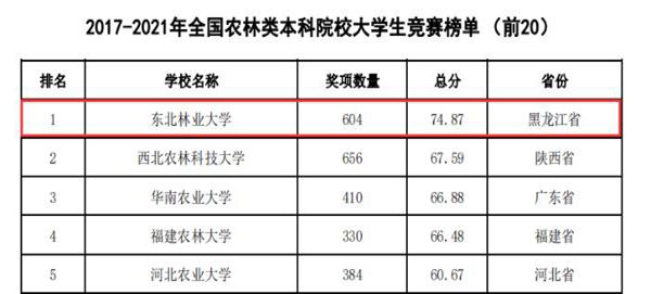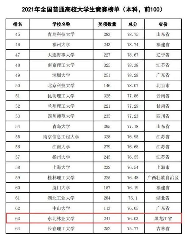 黑龍江經(jīng)濟(jì)網(wǎng)訊(黑龍江日?qǐng)?bào)全媒體見習(xí)記者董廣碩 商祺)近日,中國(guó)高等教育學(xué)會(huì)高校競(jìng)賽評(píng)估與管理體系研究工作組發(fā)布2021全國(guó)普通高校大學(xué)生競(jìng)賽分析報(bào)告,在《2017-2021年農(nóng)林類本科院校大學(xué)生競(jìng)賽排行榜TOP20》中。東北林業(yè)大學(xué)以總分74.87(獲獎(jiǎng)604項(xiàng))的優(yōu)異成績(jī)連續(xù)四年蟬聯(lián)榜首。
