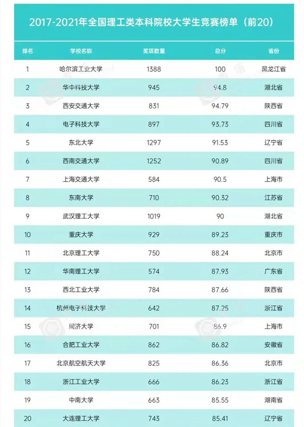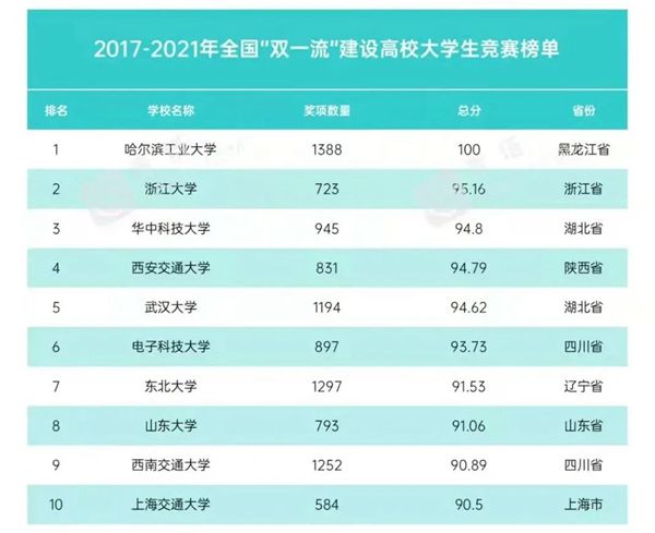 在同時(shí)發(fā)布的2017—2021年全國“雙一流”建設(shè)高校大學(xué)生競(jìng)賽榜單和全國理工類本科院校大學(xué)生競(jìng)賽榜單中,哈爾濱工業(yè)大學(xué)均列榜首。