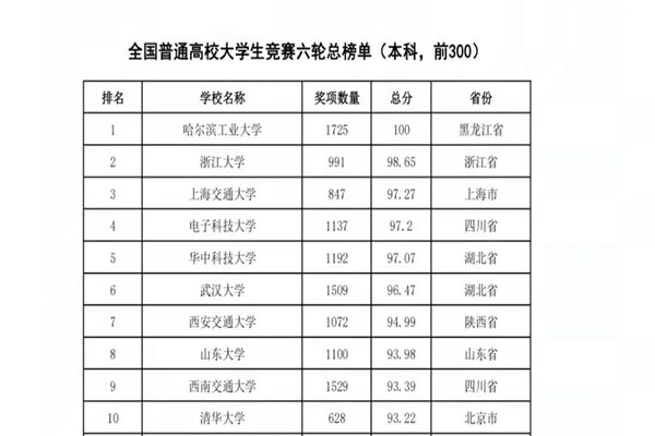 哈爾濱工業(yè)大學(xué)以獲獎(jiǎng)數(shù)量1725項(xiàng)、總分100分的絕對(duì)優(yōu)勢(shì)獲得全國普通高校大學(xué)生競(jìng)賽六輪總榜單冠軍。