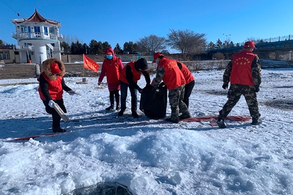活動中,森調(diào)隊15名志愿者們身著志愿者紅馬甲,手拎垃圾袋,走在濕地兩側(cè)一邊互相提醒,一邊認真地撿拾游客丟棄在濕地周邊的礦泉水瓶、煙蒂、碎紙屑、塑料袋等生活垃圾。由于氣溫轉(zhuǎn)暖,冰面濕滑,給清理垃圾工作帶來一定難度,志愿者們克服困難,利用一個多小時的時間,還濕地周邊一片干凈、整潔的環(huán)境。