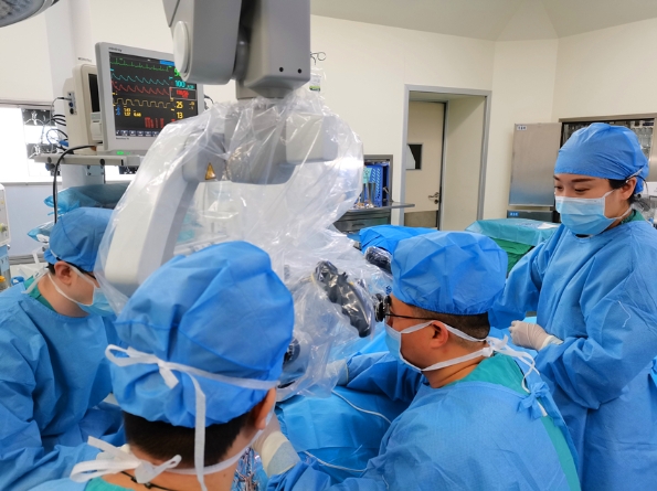 檢查結(jié)果出來后,孫國章主任醫(yī)師建議王女士行右側(cè)顳葉占位切除并行病理檢查。與家屬詳細交代手術(shù)的必要性及相關(guān)風險,患者家屬表示知情同意行手術(shù)治療。術(shù)前準備完畢后,孫國章主任醫(yī)師為王女士在全麻下進行了右側(cè)顳葉占位切除+血腫清除術(shù),術(shù)中孫國章主任醫(yī)師在顯微鏡下仔細分離腫瘤組織與腦組織邊界,將腫瘤組織全切并將血腫全部清除,手術(shù)過程順利。王女士術(shù)后恢復良好,頭部CT復查顯示腫瘤完全切除,血腫清除徹底,病理回報為腦膠質(zhì)母細胞瘤,現(xiàn)已出院準備進行放化療等下一步綜合治療。