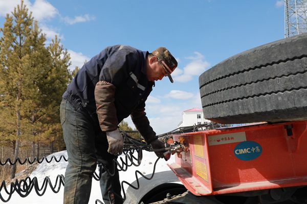 阿木爾林業(yè)局多種經(jīng)營(yíng)公司職工在保養(yǎng)拖掛車(chē)的制動(dòng)系統(tǒng)(王力 攝)