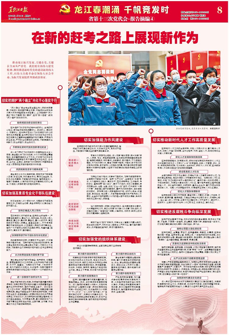 推動龍江振興發(fā)展,關(guān)鍵在黨,關(guān)鍵在全面從嚴治黨。我們要弘揚偉大建黨精神,繼續(xù)推進新時代黨的建設新的偉大工程,以偉大自我革命引領(lǐng)偉大社會革命,為振興發(fā)展提供堅強政治保證。