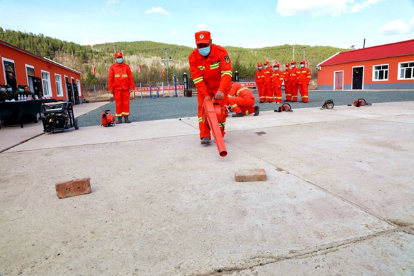阿木爾林業(yè)局綠林林場(chǎng)專業(yè)撲火隊(duì)員在進(jìn)行風(fēng)力滅火機(jī)、油鋸的拆裝維修使用比賽(王力 攝)