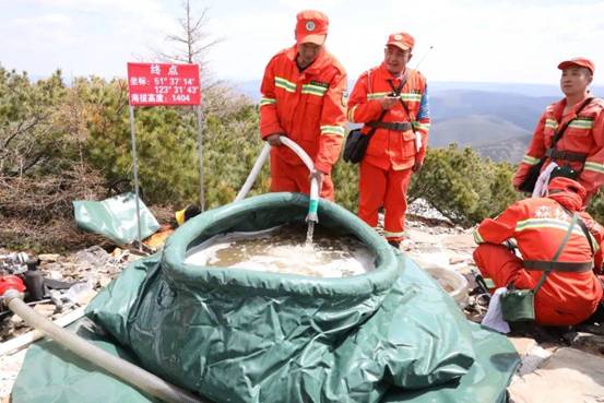 據(jù)了解,此次演練模擬小白山最高峰海拔1404米的“興安第一塔”附近偃松林發(fā)生火情,在海拔886米尋找到一處水源地,撲火隊(duì)員利用高揚(yáng)程山地引水泵向1150米處放置的儲(chǔ)水囊供水,同時(shí)架設(shè)第二臺(tái)水泵向山頂供水,兩臺(tái)水泵交叉接力成功將水引向小白山最高峰,噴淋“興安第一塔”,整個(gè)過(guò)程鋪設(shè)水帶全長(zhǎng)3740延長(zhǎng)米,垂直爬高519米。