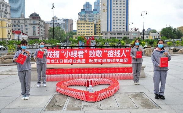 5月27日,由黑龍江日報報業(yè)集團(tuán)和哈爾濱秋田虹健康科技集團(tuán)共同發(fā)起的“龍報‘小綠君’,致敬‘疫線人’”系列公益活動,在哈爾濱火車站南廣場正式啟動。黑龍江日報報業(yè)集團(tuán)、哈爾濱市委宣傳部、哈爾濱市公安局巡特警支隊、哈爾濱秋田虹健康科技集團(tuán)領(lǐng)導(dǎo)出席啟動儀式。