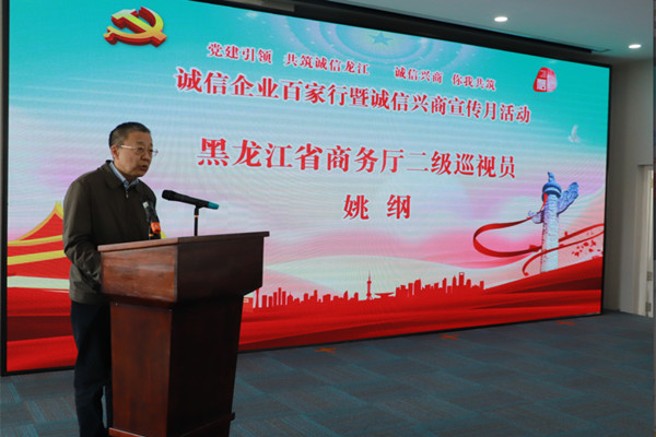 省商務(wù)廳二級巡視員姚綱在致辭中指出,此次黑龍江省“誠信企業(yè)百家行”暨“誠信興商宣傳月”活動,是加強誠信宣傳,提升全社會誠實守信意識,優(yōu)化消費和營商環(huán)境的一次重要舉措。省商務(wù)廳將會同相關(guān)單位統(tǒng)籌協(xié)調(diào)、密切配合,做到政府帶頭講誠信,商貿(mào)流通企業(yè)為“誠信興商”活動主體,通過宣傳商務(wù)誠信文化和信用管理知識,引導(dǎo)市場主體樹立誠信興商經(jīng)營理念,提高信用管理能力,營造崇信守法的營商環(huán)境。培育消費者信用消費習(xí)慣,提升風(fēng)險防范意識,依法維護自身合法權(quán)益,引導(dǎo)和帶動整個商貿(mào)行業(yè)的誠信建設(shè)。