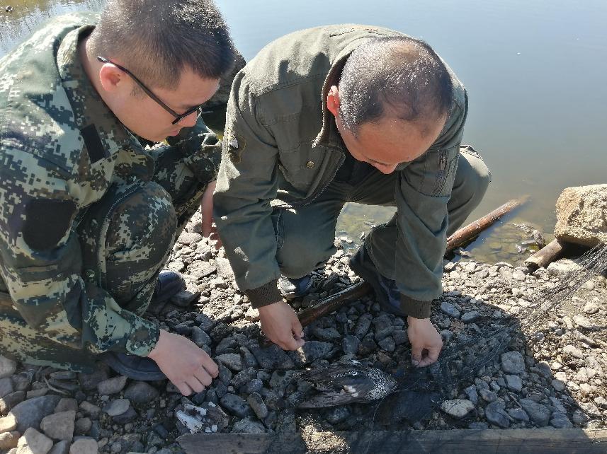 圖強林業(yè)局森林資源管理科工作人員在壯林林場施業(yè)區(qū)檢查工作時,發(fā)現(xiàn)一只綠翅鴨被粘網(wǎng)粘住,資源科工作人員對其展開營救。