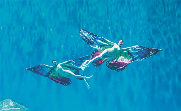 哈爾濱極地公園的水舞秀表演會(huì)聚國(guó)內(nèi)頂級(jí)水舞表演藝術(shù)家,汲取花樣游泳、芭蕾舞、形體藝術(shù)的精華。演員不僅需要克服6米深海水的巨大浮力,還要克服相當(dāng)于陸地上12倍的巨大阻力,在0.5秒內(nèi)展開(kāi)4米長(zhǎng)的巨大蝴蝶羽翼,閉氣空潛3分鐘,完成一系列“蝶舞”動(dòng)作,難度極高!炫彩的羽翼、波光粼粼的海水、五彩斑斕的魚(yú)兒融合在一起,美輪美奐。