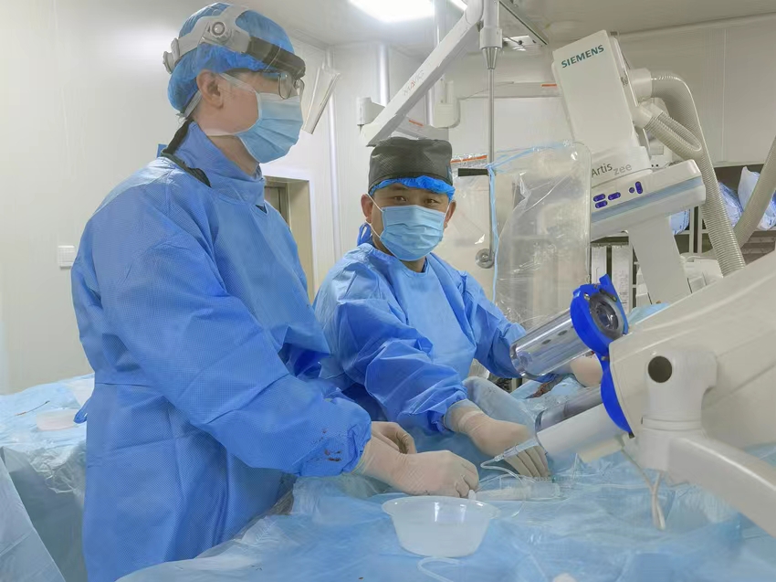 “患者入院后雖進(jìn)行了快速靜脈溶栓,但病情依然進(jìn)展性加重,我們發(fā)現(xiàn)患者病情為顱內(nèi)主干血管閉塞導(dǎo)致,情況十分危急,如果不及時介入開通閉塞的顱內(nèi)大血管,一旦錯過治療最佳時機(jī),患者就可能會出現(xiàn)危及性命等情況?!泵F副主任醫(yī)師回憶了當(dāng)時搶救情景。搶救刻不容緩,在爭得家屬同意并簽字后,神經(jīng)介入團(tuán)隊立即將張先生送至導(dǎo)管室進(jìn)行介入取栓治療。