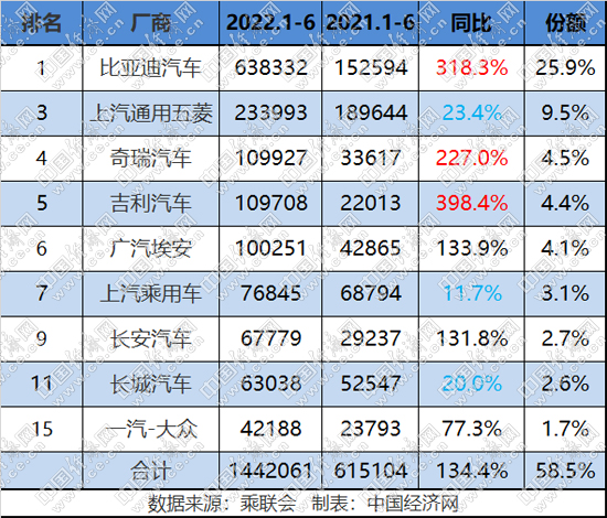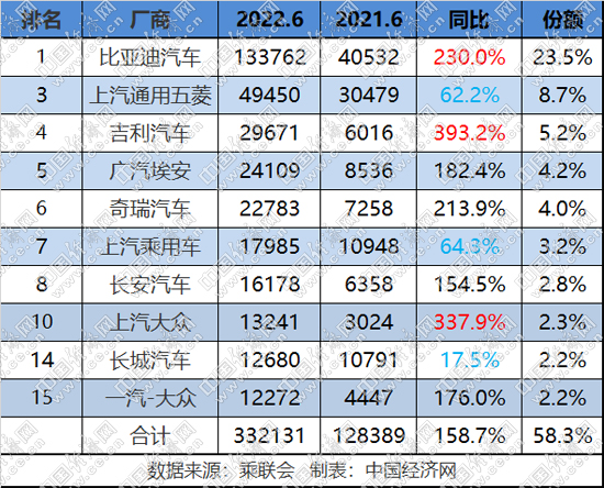 在乘聯會發(fā)布的6月新能源乘用車批發(fā)銷量廠商排名(TOP15)中,傳統品牌占據10席,共計銷售33.2萬輛,同比增長158.7%,市場份額接近六成,達到58.3%,1-6月,傳統品牌新能源累計銷售144.2萬輛,同比增長134.4%,份額同樣接近六成,為58.5%。