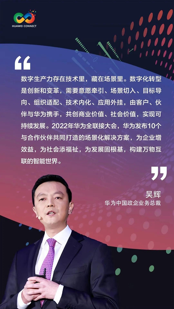 當(dāng)前,我國的數(shù)字化已經(jīng)進(jìn)入快車道,釋放數(shù)字生產(chǎn)力正當(dāng)其時(shí)。而“數(shù)字生產(chǎn)力就存在技術(shù)里,藏在場景里?!被诖?,華為中國政企業(yè)務(wù)總裁吳輝在會(huì)上發(fā)表了題為《為行業(yè)找技術(shù),深入場景創(chuàng)造價(jià)值》的主題演講,重點(diǎn)分享了華為基于多年的探索和實(shí)踐總結(jié)出的行業(yè)數(shù)字化轉(zhuǎn)型的方法論和企業(yè)轉(zhuǎn)型成功秘訣。