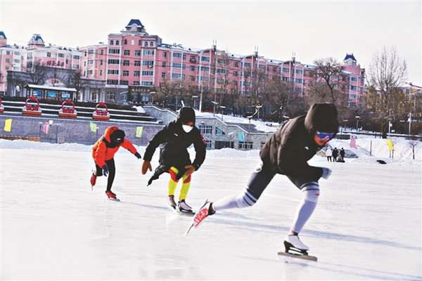 在中俄體育公園,8000平方米的滑冰場(chǎng)聚集了綏芬河市冰球運(yùn)動(dòng)愛好者和青少年速度滑冰愛好者,他們最小的6歲,最大的50多歲。在冰球運(yùn)動(dòng)展示活動(dòng)中,頭戴球盔、身披護(hù)具的孩子們斗志昂揚(yáng),踏上冰場(chǎng)的他們?nèi)缤荣惖倪x手一樣,來去如風(fēng)穿梭自如,既帥又酷,團(tuán)隊(duì)配合對(duì)抗激烈。剛在對(duì)方球門前射門,一眨眼工夫,球已經(jīng)到了另一方球門前。速度滑冰愛好者們你追我趕,激情享受這一北方冬天特有運(yùn)動(dòng)帶來的樂趣。滑冰愛好者王瑞說:“我非常喜歡在冰上飛馳的感覺,我最喜歡冬天了,冬天會(huì)有冰場(chǎng),大家可以在一起滑冰,一起交流,一起歡笑?!?/span>