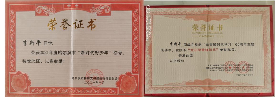 李新平同學(xué)就讀于呼蘭區(qū)建國(guó)小學(xué)五年五班,他勤奮好學(xué)、品學(xué)兼優(yōu)、樂(lè)觀向上、自強(qiáng)自立。從一年級(jí)開(kāi)始就擔(dān)任班長(zhǎng)職務(wù),先后多次被評(píng)為三好學(xué)生、優(yōu)秀學(xué)生干部、優(yōu)秀少先隊(duì)員,榮獲2021年度哈爾濱市“新時(shí)代好少年”稱號(hào)、榮獲2021年第三屆龍江好少年活動(dòng)“龍江愛(ài)心大使”和“城市形象大使”,2022年被黑龍江省積善之家?guī)头鲋行那嗌倌曛驹刚呖傟?duì)授予“公益達(dá)人”稱號(hào),2023年在紀(jì)念“向雷鋒同志學(xué)習(xí)”60周年主題活動(dòng)中被韓振清學(xué)雷鋒創(chuàng)新工作室授予“龍江學(xué)雷鋒標(biāo)兵”榮譽(yù)稱號(hào)。在多類(lèi)體育運(yùn)動(dòng)競(jìng)賽活動(dòng)中獲得等級(jí)證書(shū)及榮譽(yù)稱號(hào),出色的表現(xiàn)和真誠(chéng)的付出,贏得了大家的信任、同學(xué)們的信賴、家長(zhǎng)們的喜愛(ài)。