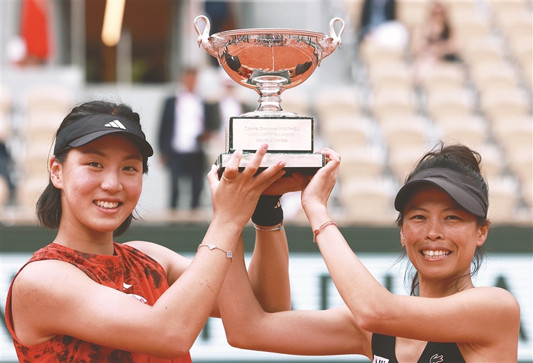 當(dāng)日,在2023法國網(wǎng)球公開賽女子雙打決賽中,王欣瑜(中國)/謝淑薇(中國臺(tái)北)以2比1戰(zhàn)勝費(fèi)爾南德斯(加拿大)/湯森(美國),奪得冠軍。