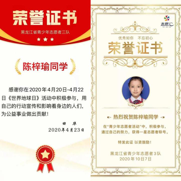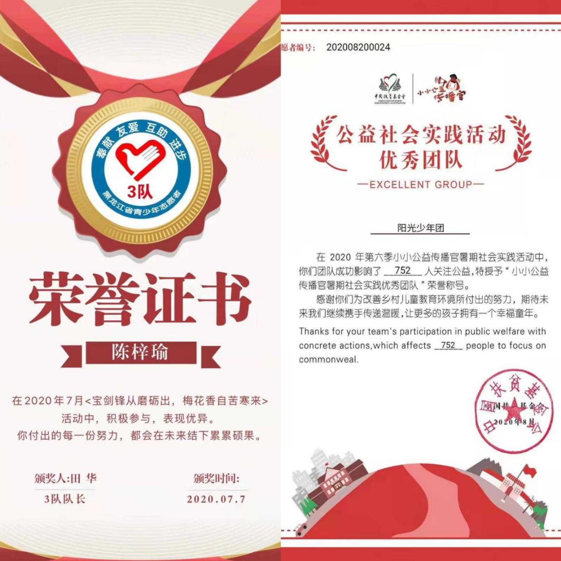 她在志愿服務(wù)中不怕苦不怕累,圓滿完成各項(xiàng)任務(wù),獲得各界一致好評,先后獲得省市(區(qū))的相關(guān)表彰,并被省幫扶中心授予“愛心少年”榮譽(yù)稱號(hào)。