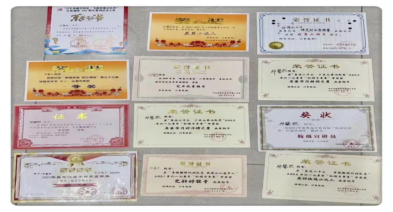 在成長過程中,面對學(xué)習(xí),她不斷挑戰(zhàn)自我,勇于創(chuàng)新,努力去探索新領(lǐng)域,收獲新知識。邱馨然不僅熱愛學(xué)習(xí),而且注重興趣的發(fā)展,先后獲得中國歌劇舞劇院頒發(fā)的全國社會藝術(shù)水平考級朗誦九級,中國舞蹈家協(xié)會頒發(fā)中國舞九級,中國音樂學(xué)院頒發(fā)古箏二級,文化和旅游部發(fā)展中心頒發(fā)硬筆書法四級,中國文化信息協(xié)會頒發(fā)“文明與藝術(shù)”少年英才藝術(shù)全國總展演獨(dú)舞一級等11個(gè)國家級獎項(xiàng)和30多個(gè)省級、市級、區(qū)級、校級獎項(xiàng)。