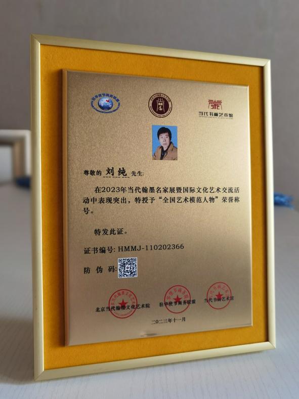 黑龍江經(jīng)濟(jì)網(wǎng)訊(記者王振紅 文/攝)日前,由北京當(dāng)代翰墨文化藝術(shù)院主辦的全國第五屆當(dāng)代翰墨名家展頒獎(jiǎng)盛典在北京圓滿結(jié)束。應(yīng)巴基斯坦駐華大使館邀請(qǐng),與會(huì)藝術(shù)家參加了中巴文化藝術(shù)交流并贈(zèng)送書畫作品。龍江著名美術(shù)家劉純獲大賽一等獎(jiǎng),被主辦單位與駐華使節(jié)商務(wù)聯(lián)盟(ECCAC)共同授予“全國藝術(shù)模范人物”榮譽(yù)稱號(hào)和中外國際文化交流大使。