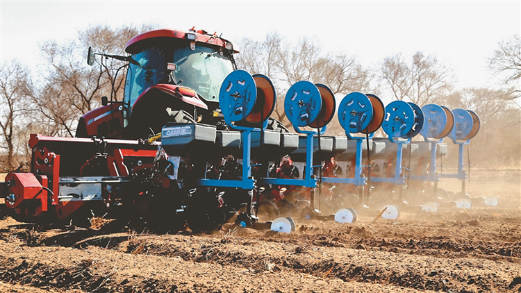 滴灌管帶鋪設(shè)與玉米播種同時進(jìn)行。 王飛飛攝