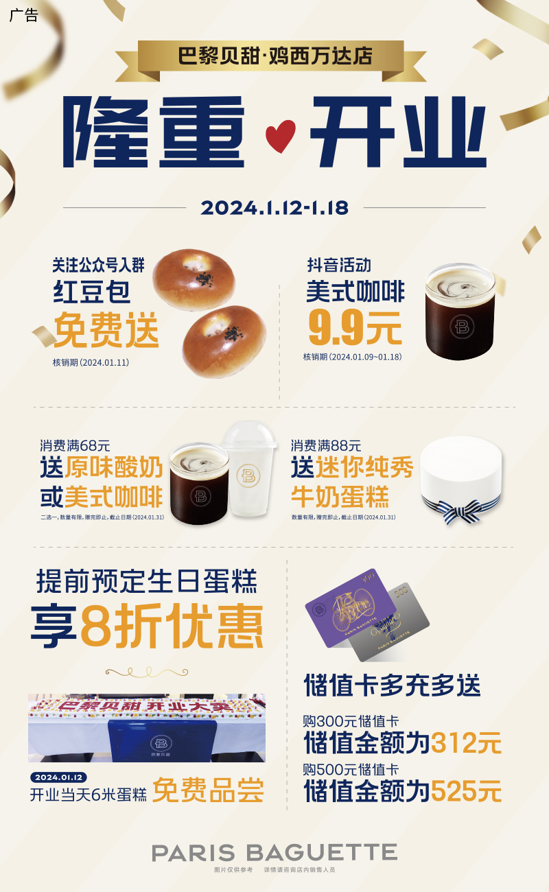 濃郁又甜蜜的面包香氣縈繞在店內(nèi),讓顧客走進(jìn)店里的一瞬間,心情也會(huì)跟著變好。為了讓顧客有更好的購買體驗(yàn),巴黎貝甜雞西萬達(dá)新店在新店開業(yè)期間,特推出關(guān)注公眾號(hào)入群即送禮活動(dòng),還在抖音平臺(tái)推出9.9元美式咖啡優(yōu)惠券;還有消費(fèi)滿贈(zèng)多個(gè)指定產(chǎn)品、提前兩天預(yù)訂生日蛋糕可享八折優(yōu)惠和超劃算的儲(chǔ)值優(yōu)惠活動(dòng),在開業(yè)當(dāng)天也可以免費(fèi)品嘗新鮮制作的大蛋糕。