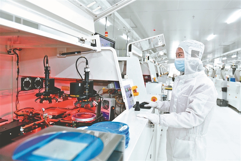 在山東省巨野縣新一代信息技術(shù)產(chǎn)業(yè)園,工作人員在直顯芯片生產(chǎn)設(shè)備前值守。新華社記者 郭緒雷攝