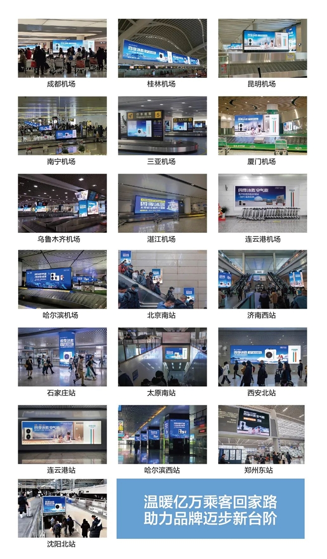 除了四季沐歌空氣能冠名高鐵“冰火”專列與溫暖驛站守護(hù)之外,四季沐歌空氣能更是在全國開啟“霸屏”模式,廣告覆蓋全國31個(gè)省市自治區(qū)的468個(gè)高鐵站、10大機(jī)場等核心交通樞紐的黃金廣告位,搶占春運(yùn)大流量交通樞紐,觸達(dá)全國億萬旅客視線,用不斷升級的品牌溫度、服務(wù)力度、產(chǎn)品高度與強(qiáng)勁的“冰火”視覺體驗(yàn),為出行旅客帶來前所未有的沉浸式體驗(yàn)與感官享受,溫暖著每一位乘客的幸福歸家路與探親訪友、旅游度假之旅。