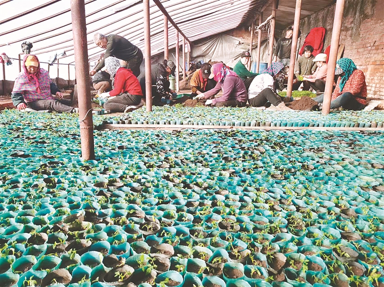 從1月中旬開始,雖然寒氣未消,育苗棚內(nèi)卻溫暖如春,潮濕溫?zé)岬目諝鈯A雜著新鮮的泥土氣息。培土、裝盤、點(diǎn)種、擺盤,種植戶們有條不紊地忙碌著育苗,在育苗盤中栽下創(chuàng)收的“希望”。