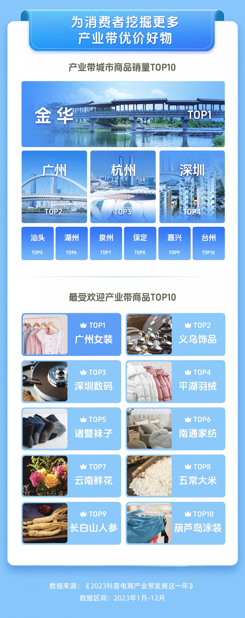 報告披露,2023年,產(chǎn)業(yè)帶商品在抖音電商銷量增長超66%,其中貨架場景銷量增長103%。銷量排行榜上,浙江金華排名第一,廣州、杭州、深圳、汕頭、湖州、泉州、嘉興、臺州等名列前十。