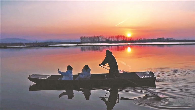 在牡丹江寧安段,夕陽下大雁飛過。江面上開化的部分,平靜的江水折射著夕陽波光粼粼;未開化的地方還有少許冰面和積雪,白雪與黑水交錯(cuò),畫面靜謐而美好。在寧安市拐彎村,江面上有漁船來回劃過,市民坐在漁船上用手機(jī)記錄下大雁、夕陽的美景。